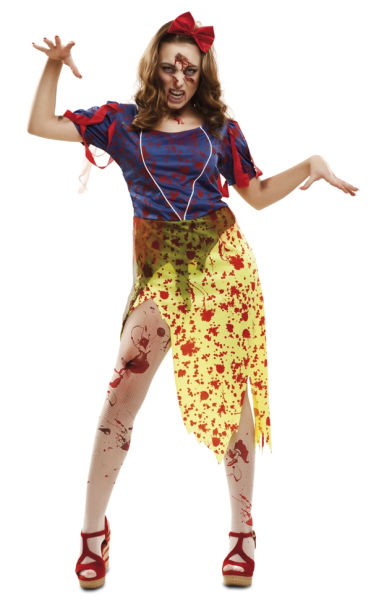 Šaty mají modrou vrchní část s krátkými rukávy, které jsou zdobené červenými proužky látky. Na hrudníku jsou dva bílé proužky přišity do písmene V. Žlutá sukně je na spodním švu cípatá, tvořící dojem roztrhané sukně. V pase jsou sem tam přišity cáry červené a černé průhledné látky. Celé šaty jsou s krvavými skvrnami. Kostým doplňuje čelenka s červenou mašlí.